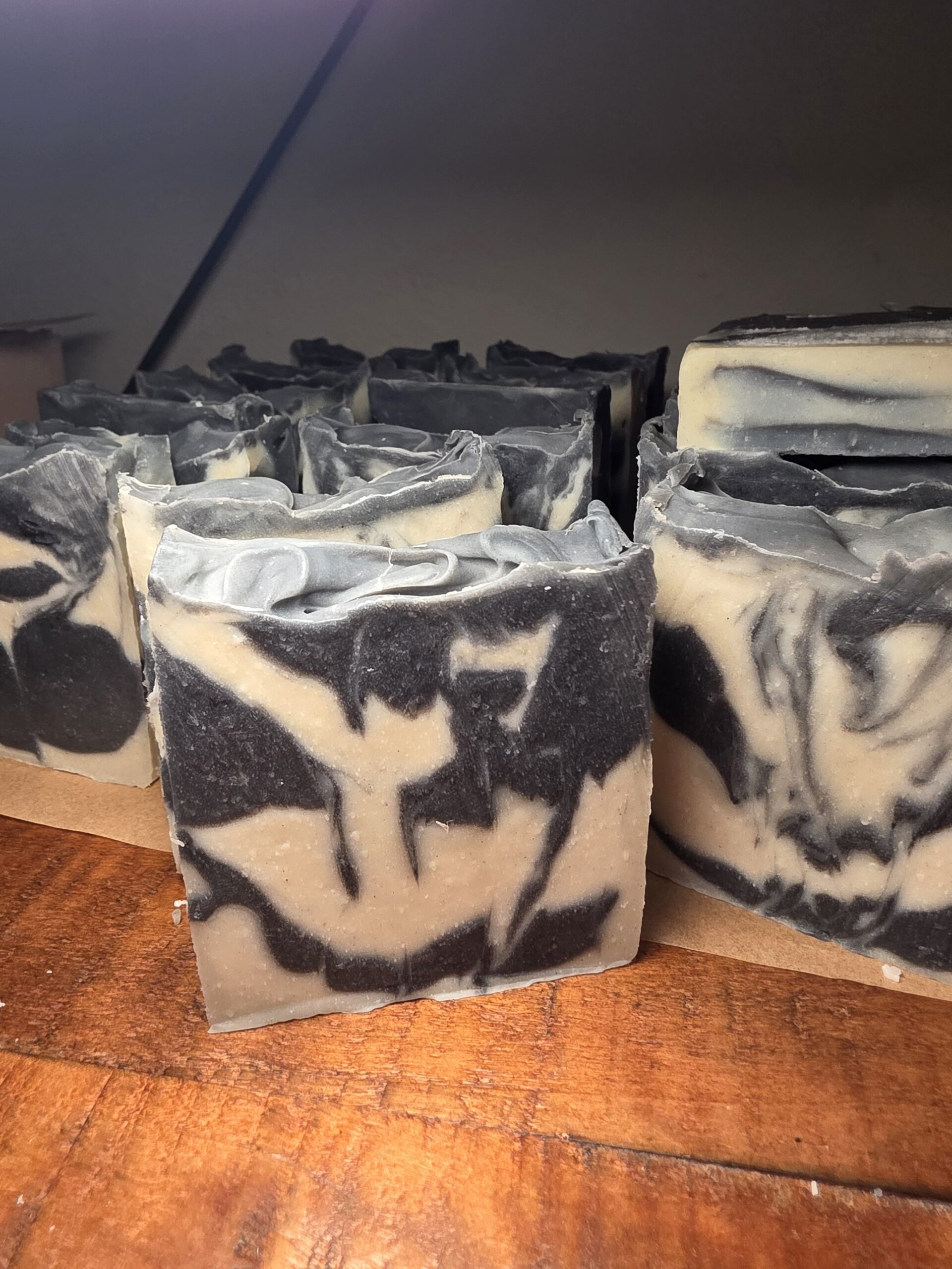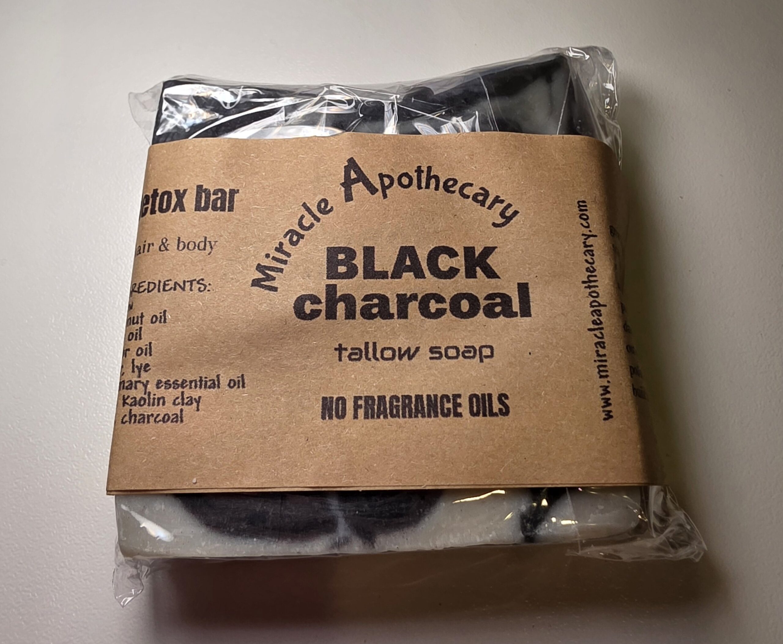 Ingredients: Tallow, coconut oil, olive oil, castor oil, water, lye, rosemary essential oil, white kaolin clay, black charcoal